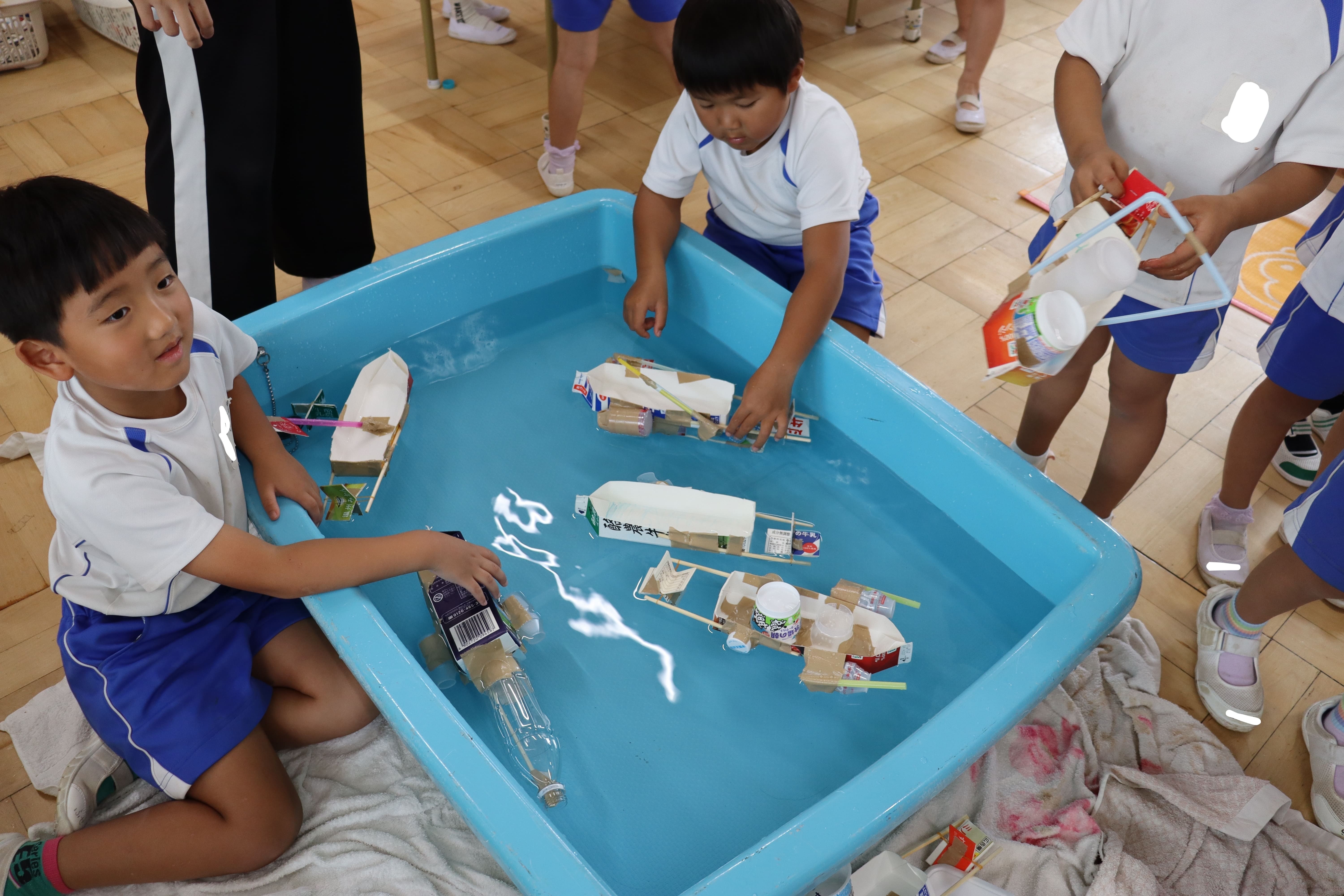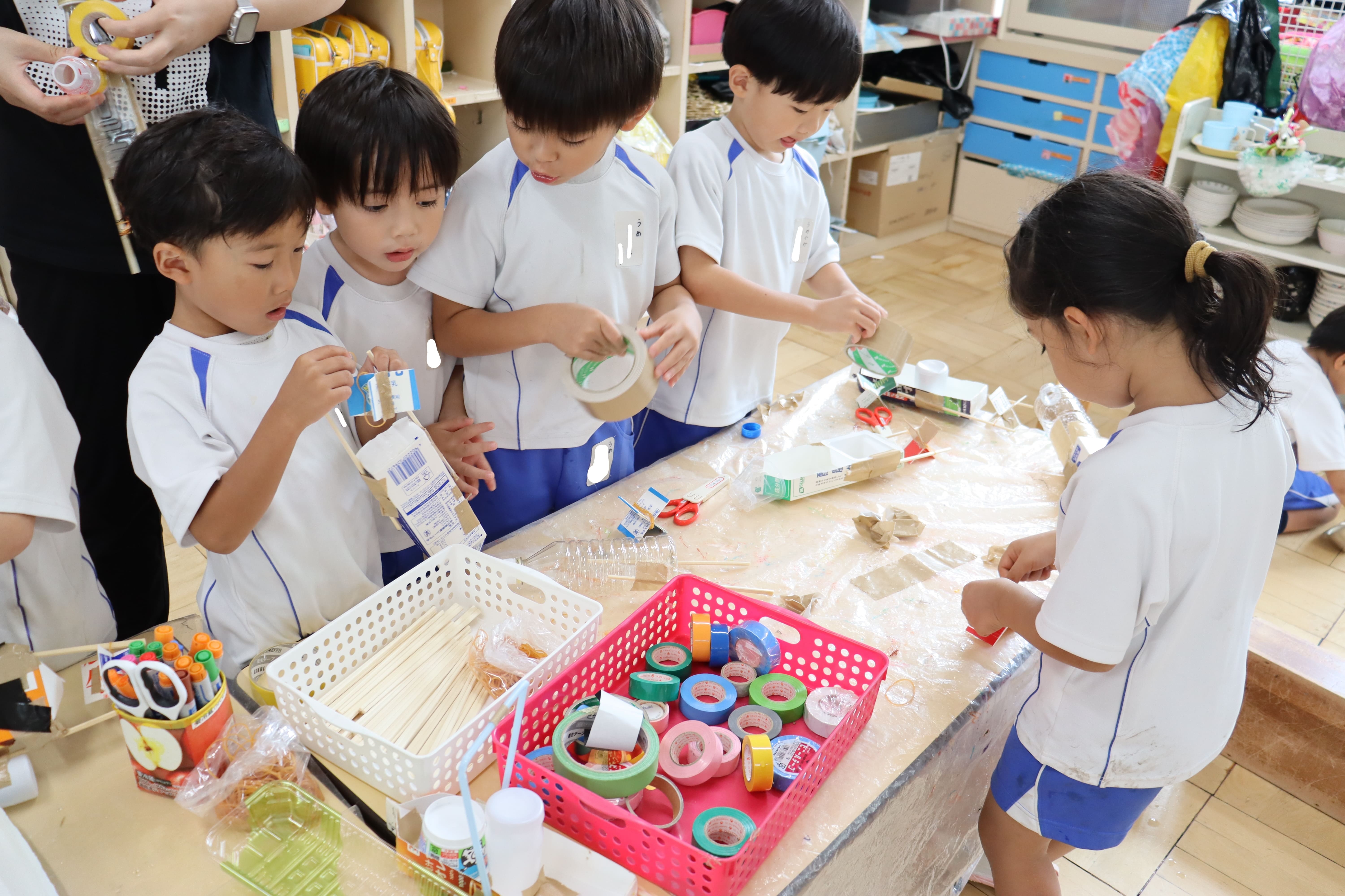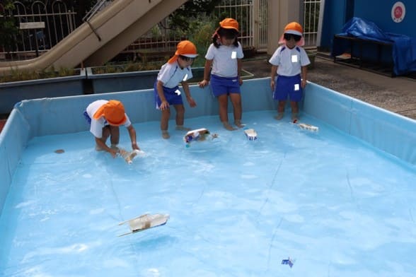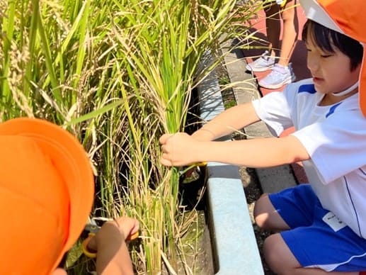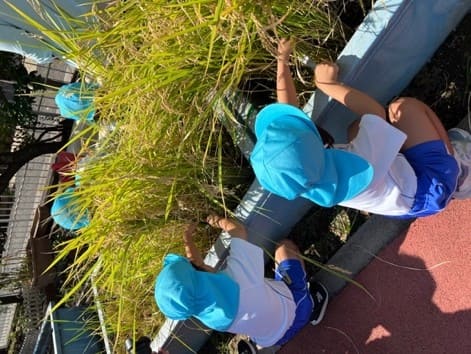 1学期に田植えをした苗が実り、自分たちで稲刈りをしました。一握り持ち、根本をハサミで切りました。紙を切る感覚とは違い、少し固い感触に苦戦する姿も見られました。 また、好きな遊びでは、動力付きの舟を作りました。水に強い素材を考え、どのように作れば進むのか、倒れないのかなど、失敗を繰り返しながら、考え、改良し、試して遊んでいます。