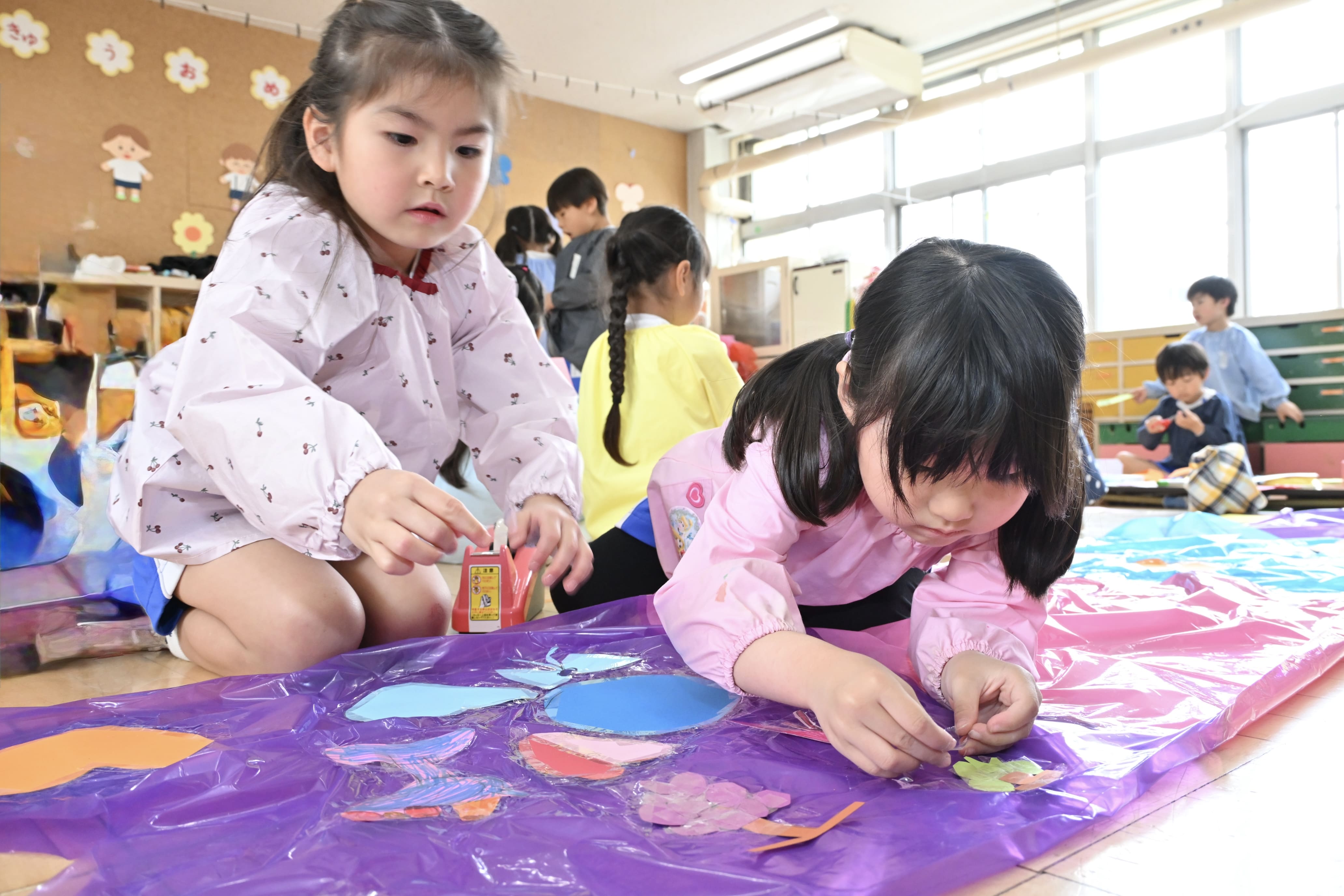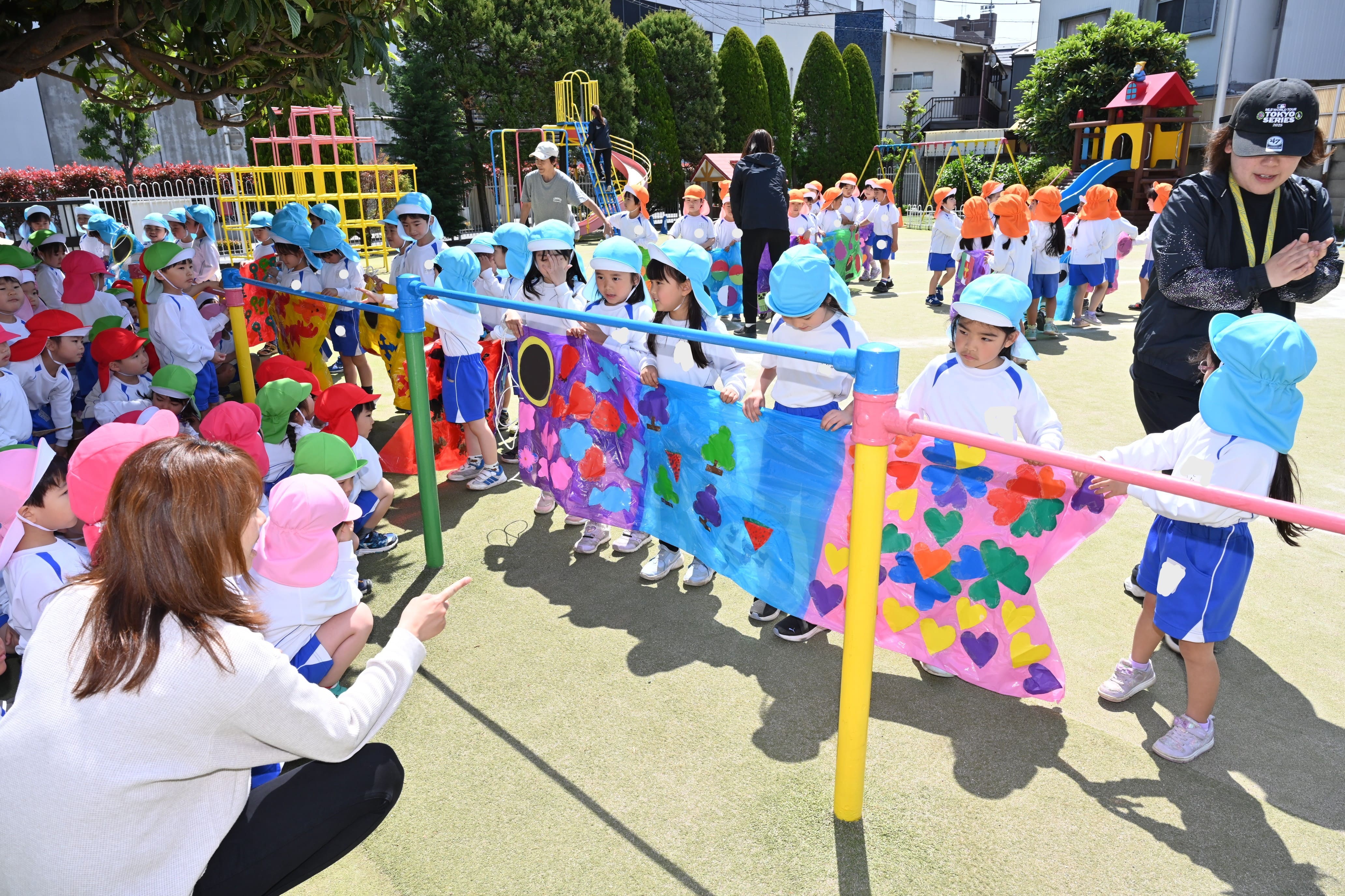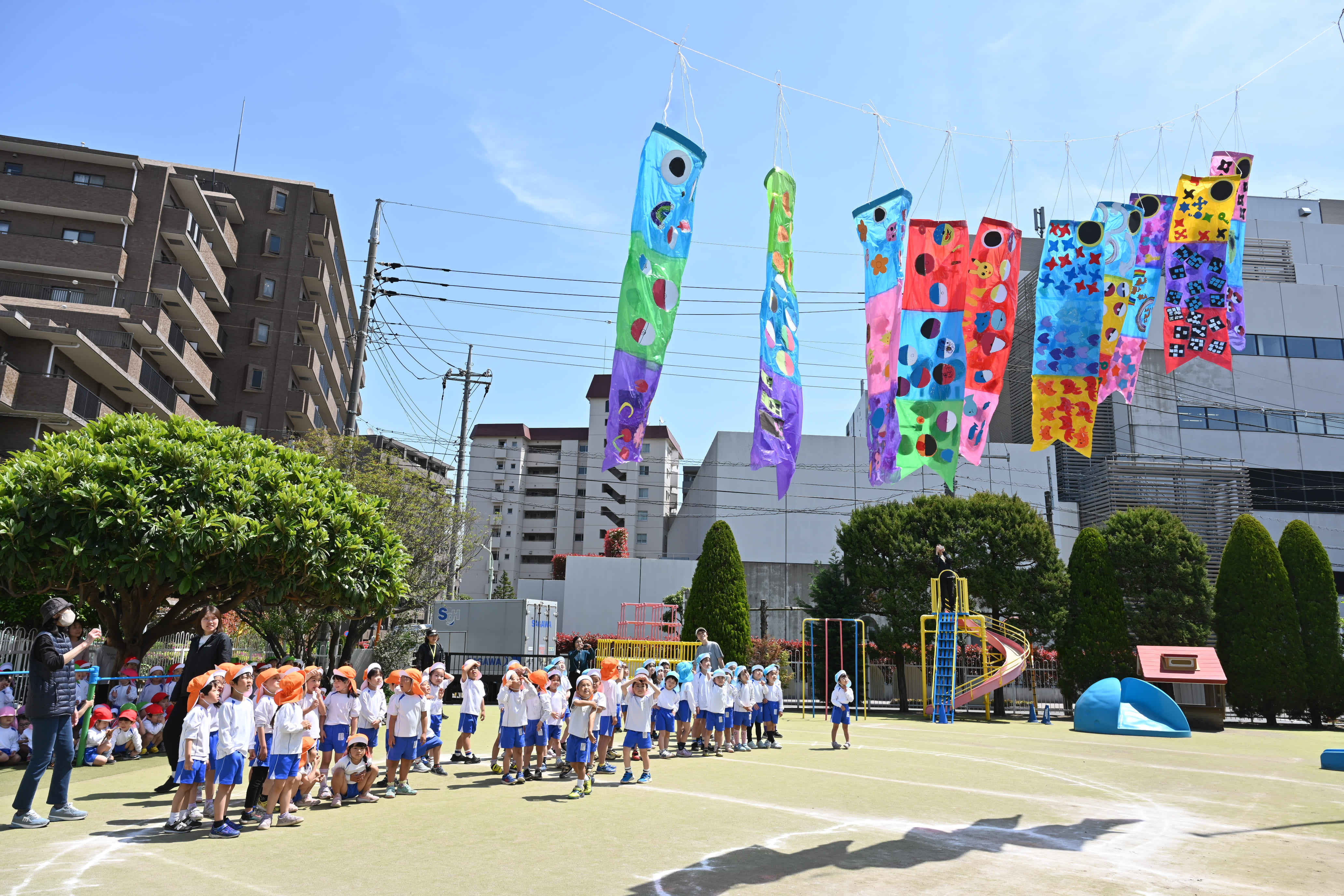 2人組で話し合いをしながら大きいこいのぼりを作りました。こいのぼり完成会には、年少組や年中組も見に来て、こいのぼりは空高く上がりました。自分たちが作ったこいのぼりが泳いでいる様子を見て子どもたちは大興奮でした。